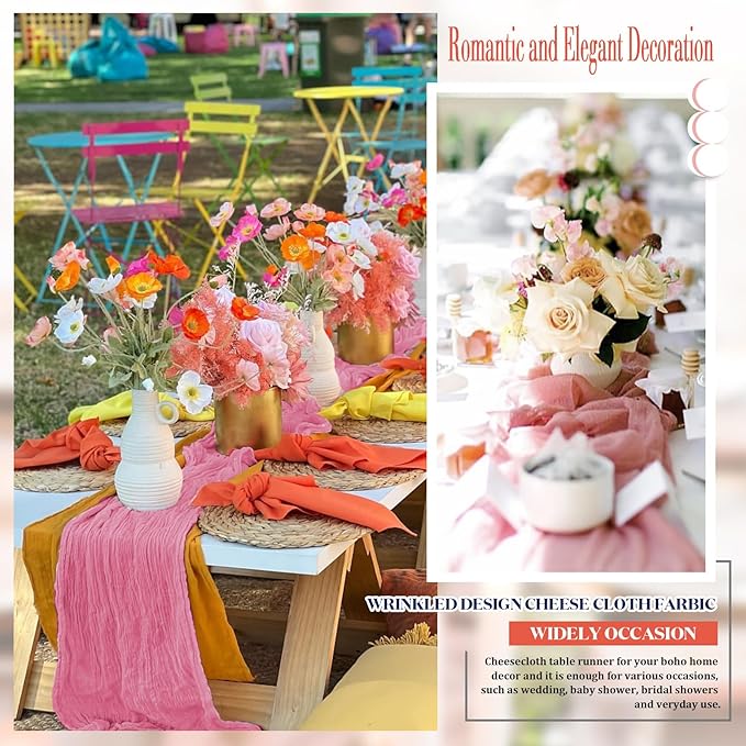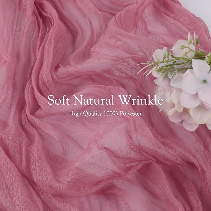 - 【Premium Material】Cheesecloth table runner is made of high quality polyester with wrinkled design, delicate edges and stitches, adopts seamless technique. The wedding table runner is soft, sheer, natural drape, washable and reusable. Cheese cloth fabric is lightweight enough to sway freely in the breeze when used outdoors and will fade-resistant.