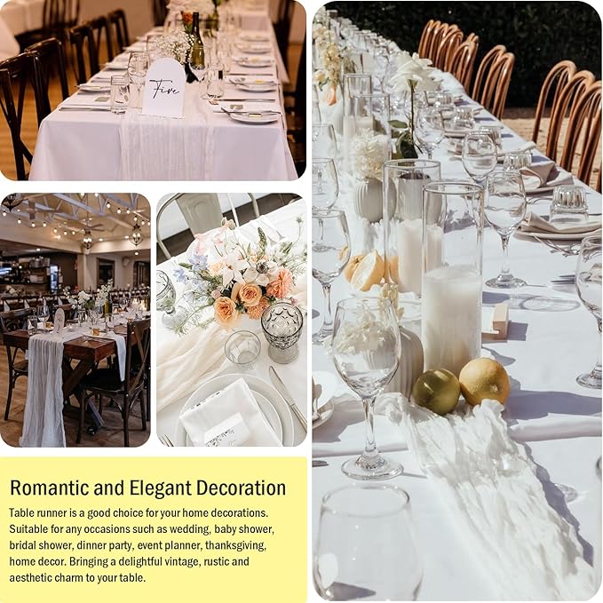 - 【Premium Material】Cheesecloth table runner is made of high quality polyester with wrinkled design, delicate edges and stitches, adopts seamless technique. The wedding table runner is soft, sheer, natural drape, washable and reusable. Cheese cloth fabric is lightweight enough to sway freely in the breeze when used outdoors and will fade-resistant.