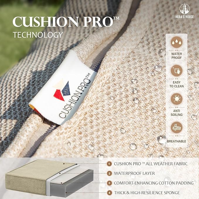 - 【ALL WEATHER USE】Special CUSHION PRO technology applied on the fabric of this conversation set. It makes the dirts be easily wiped down. Water-proof and oil-proof perfectly for all seasons use.
