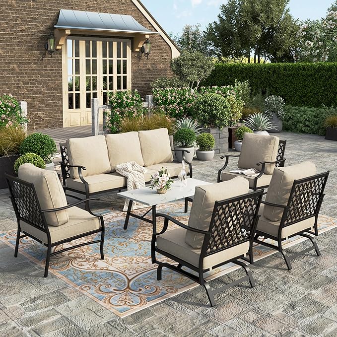 - 【A PRACTICAL OUTDOOR FURNITURE SET】Including 1 x coffee table, 2 x rocking cushioned chair, 2 x metal cushioned chair, 1 x 3 seat sofa. Perfectly fitting with your backyard, poolside, balcony, garden and deck to create an outdoor comfort zone. A REAL PRACTICAL patio conversation set perfectly meet the requirement of enjoying outdoor leisure time like a meal or host a party with your family or friends.