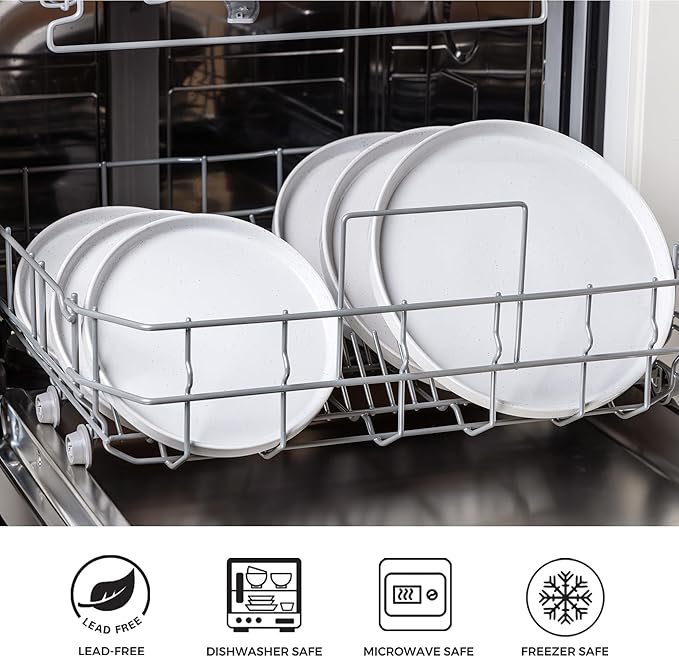 - Stackable & Less Space: the stackable dinnerware set creates a Rustic and minimalist table setting.The shape is great as it makes. they are easier to handle and hold and they stack really well without taking up much space,stack and nestle nicely in your cupboard or shelves.Our Dinnerware set is microwave,dishwasher and freezer safe,Perfect for every day use, indoors or out; ideal for any kitchen let your food look even more delicious, and make you happy every day.
