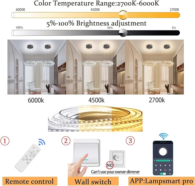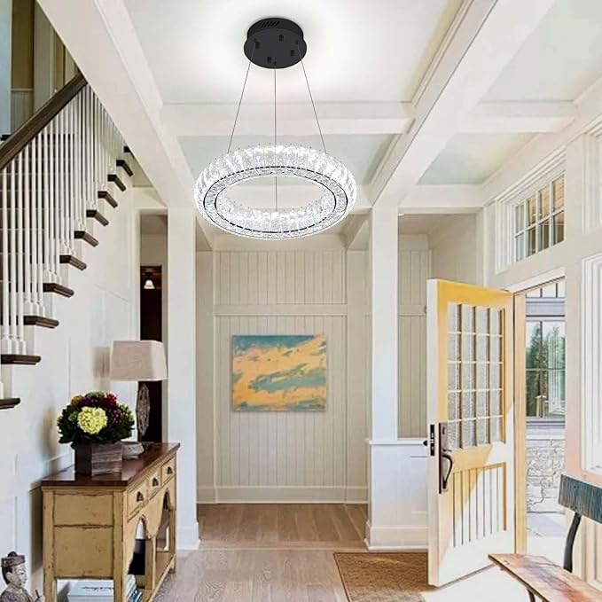 - ✨【Dimmable LED Crystal Ring Chandelier】: 8W.720Lumens. Including built-in LED light source,and remote control dimmable 3000-6000K color temperature, 5%-100% brightness adjustment,the chandeliers have their own dimmers, which can adjust different light colors according to mood. The AC85-256V voltage can be anywhere .