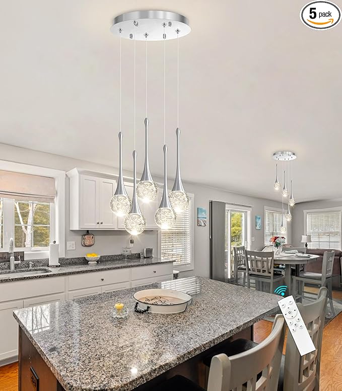 cenzoz 5-Lights Modern Pendant Lights for Kitchen Island LED Dimmable Chandelier Crystal Glam Ceiling Pendant Lighting for Dining Room Hallway Bedroom Lamp Brushed Nickel