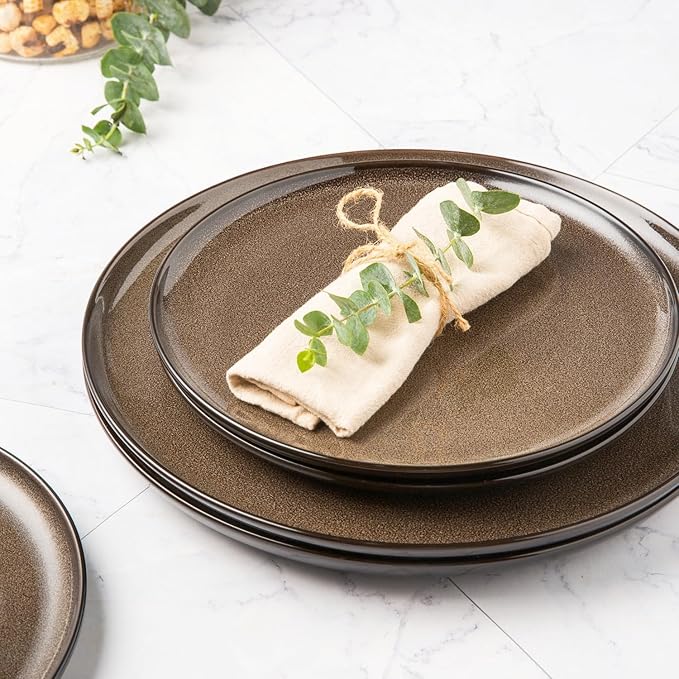 - 【 ELEGANT AND STYLISH DESIGN 】This dinnerware sets leads the dining trend with its expressive colors and finishes. With its vibrant color palette and captivating finishes, it creates an alluring ambiance that exudes warmth. The eye-catching reactive glazes and rich, vivid hues not only soothe the senses but also elevate your dining experience. The generously-sized plates provide ample space for displaying your delectable creations, while their deep bottoms prevent any sauce from spilling over.