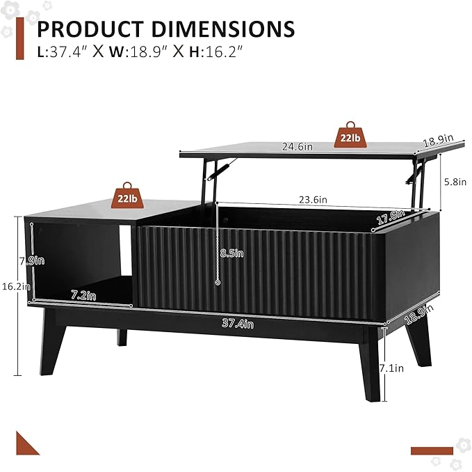 - LIFT TOP DESIGN: The wooden coffee table is equipped with an upgraded hydraulic gas strut lift top system, it ensures smoother, balanced motion, preventing slamming.It can be lifted to a height of 23.6 inches from the ground to create a comfortable workspace or dining surface while you’re sitting on the sofa.