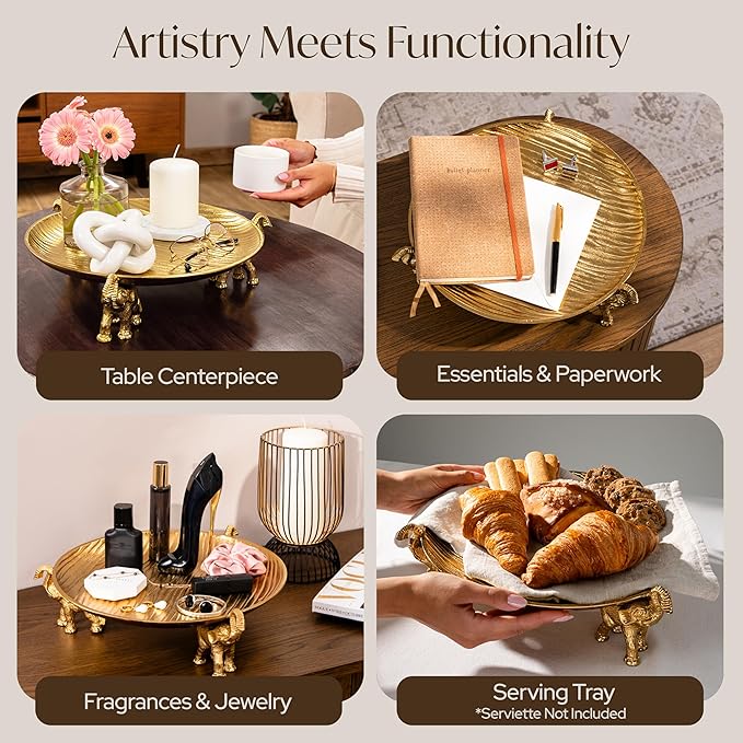 - CULTURAL & SYMBOLIC: Our elegant round tray, adorned with symbolic elephant stands, invites positive energy, good fortune, and success into your space; Elephants, with their upward-facing trunks, are known in many cultures to attract blessings, making this gold serving tray a beautiful and meaningful piece that welcomes good luck and prosperity.