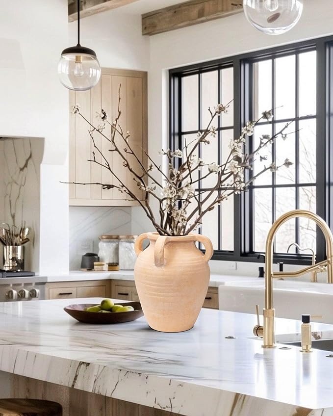 Handcrafted Flower Vase, 9.8" Tall Terracotta Vases, Vintage Rustic Ceramic Vase Décor with 4 Handles, Wide Mouth, Matte Finish for Home Office Resto Café Décor