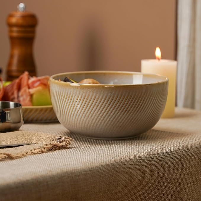 Stoneware Dinnerware Sets for 4, 12-Piece Scratch Resistant Plates and Bowls Set, Dishwasher and Microwave Safe Ceramic Dishes Set, Ribbed, Sculpted Dune
