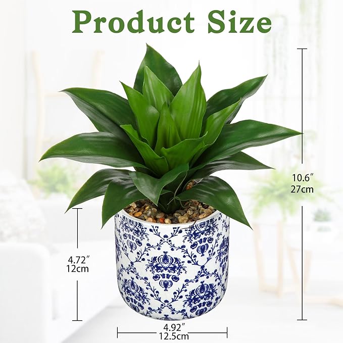 - COMPACT & PERFECTLY SIZED FOR EVERY SPACE: The blue ceramic vase complements the vibrant green foliage, adding a pop of color to your décor. Measuring approximately 4.72″ in height and 4.92″ in width, the cylindrical vase offers stability and style, this potted agave plant artificial is perfectly sized for apartments, desktops, or small areas. It’s an excellent choice among fake agave plant options and other fake plants alternatives for indoor styling.