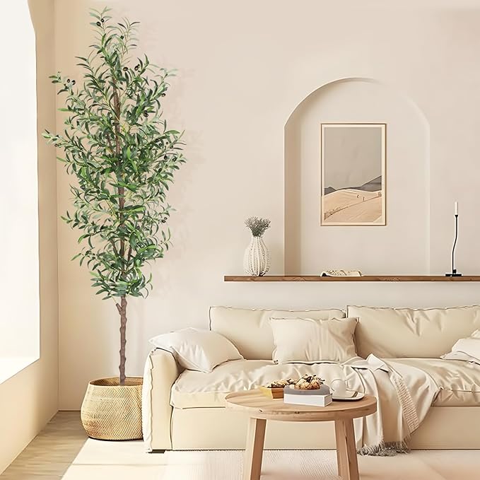- 【Realistic Faux Tropical Plants】This 8Ft tall faux olive tree features 1574 Leaves and 48 Fruits crafted from silk fabric with delicate veins. The irregular trunks add to the authentic look, making this tree incredibly realistic.