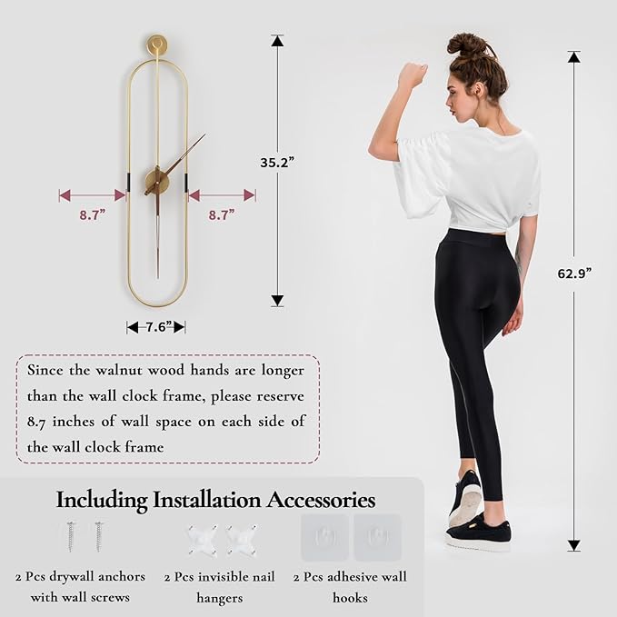 - 【Including】: 1 PCS large black oval clock(35.2"×7.6"), 2 PCS Drywall wall anchors with screws , 2 PCS adhesive wall hooks, 2 PCS invisible nail hangers and wall clocks installation manual. For optimal decor effect, please measure the wall dimensions and then select the appropriate clock size.
