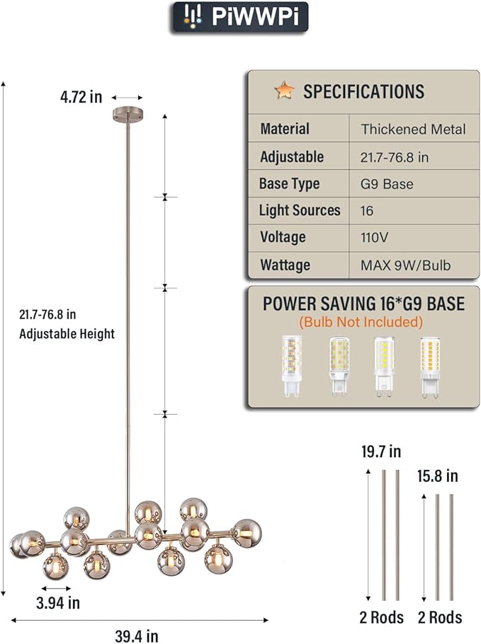 - G9 Bases & Dimmable: Requires 16 G9 bulbs (MAX 9W, Not Included). 3-color temperature G9 LED bulbs are recommended to create different atmospheres: Warm (2700K), Neutral (4000K), White (6000K). The globe chandelier is fully dimmable when paired with compatible dimmable bulbs and a switch (Also Not Included).