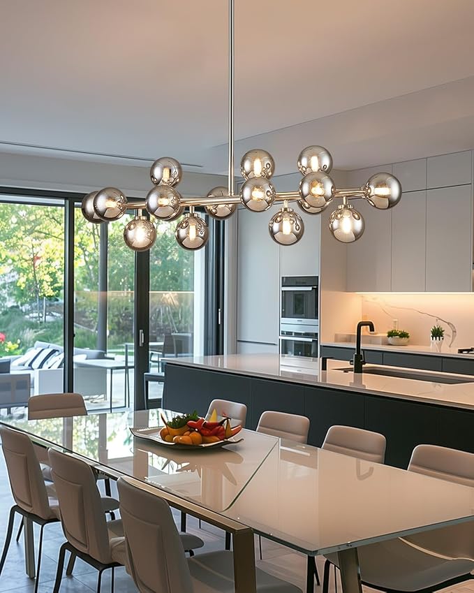 Glass Globe Sputnik Chandelier, 16-Light Mid Century Modern Light Fixture Over Table, Linear Chandeliers for Dining Room, Kitchen Island, Nickel and Smoke Grey Bubble, 40 Inch, GC-02