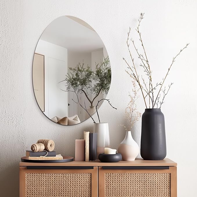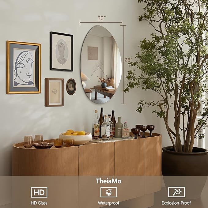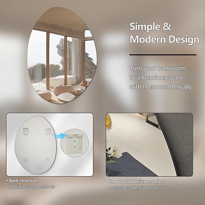 - 【Frameless Mirror】TheiaMo's frameless bathroom mirrors are made of high quality 5mm glass. Polished edge ensures safe hanging and modern look. Wall mirrors are great for reflecting natural light, creating a feeling of harmony and comfort. The irregular mirror has distinctive frameless shape is simple and sophisticated, perfect choice for traditional houses and modern lofts.