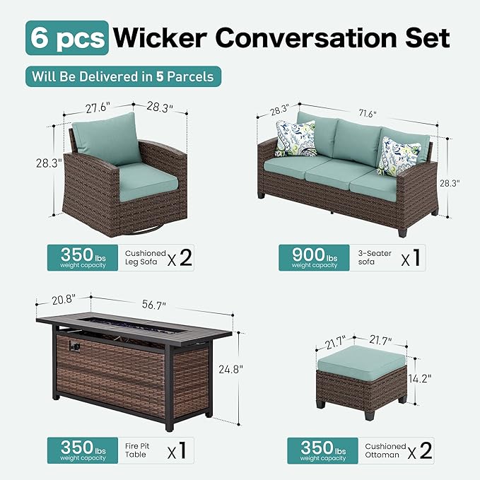 - VERSATILE PATIO FURNITURE SET : Including 1 x 3-seat sofa, 2 x swivel glider chair, 2 x ottoman, and 1 x 57''rectangle firepit table, providng 7 seats. You can rearrange them according to your need.Creating ample seats for your garden, lawn, backyard, poolside, porch, deck, baclcony and yard.