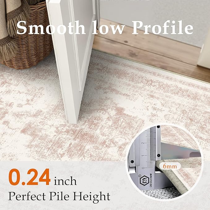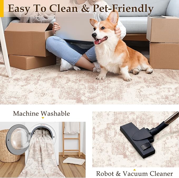 Washable Rug 8x10 Area Rug for Living Room Pink Vintage Boho Medallion Large Distressed Retro Carpet Non Slip Indoor Low Pile Small Soft Bedroom Dining Room Home Office
