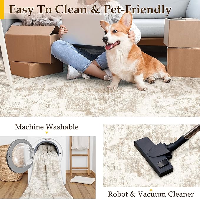 Area Rug 6x9 Cream Washable Living Room Beige Carpet Non Slip Vintage Medallion Indoor Bedroom Beige Carpet Low Pile Soft Retro Distressed Large Rug Home Office Dining Room Playroom