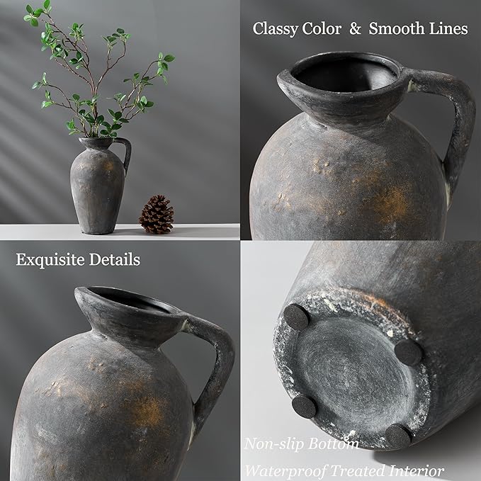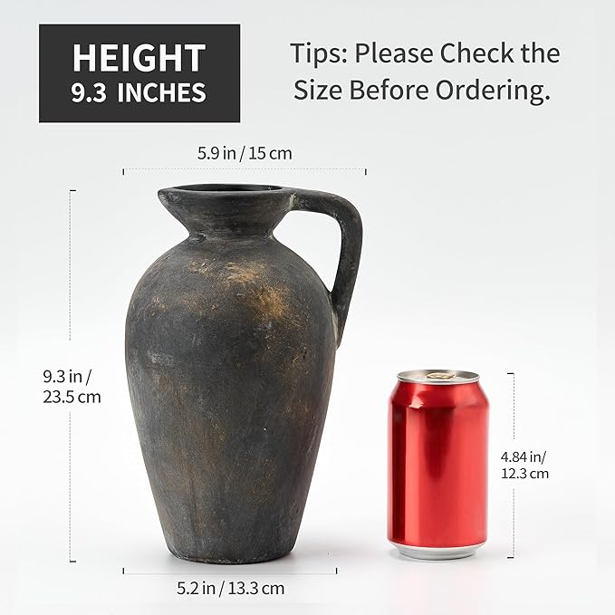 Antique Rustic Ceramic Vase, 9.3 Inch Tall Large Terracotta Vase with Handle, Vintage Farmhouse Pottery Vase for Home Decor, Living Room, Entryway, Wedding, Thanksgiving - Black Bronze
