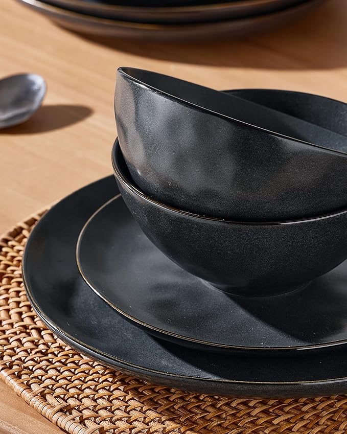 Famiware Dinnerware Sets for 8, Ocean Round 24-Piece Kitchen Plates and Bowls Sets, Microwave and Dishwasher Safe, Scratch Resistant, Matte Black