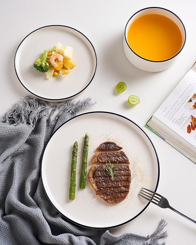 - 【High-Rimmed Edge Design with Blue Trim】Featuring high-rimmed edges, these kitchen plates prevent spills, ideal for sauces, condiments or soups. The elegant blue stroke along the edges contrasts with the pure white body, merging modern style and art—making the set a real standout at any table.