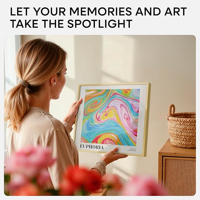Homeforia 11x11 Picture Frame Gold, High End Metal 11 by 11 Square Frames with Mat 9 x 9 Photo, 11by11 Thin Poster Frame Matted to 9x9 inch Art, Wall Hanging Frames, Tempered Glass, Wall Kit, Set of 1