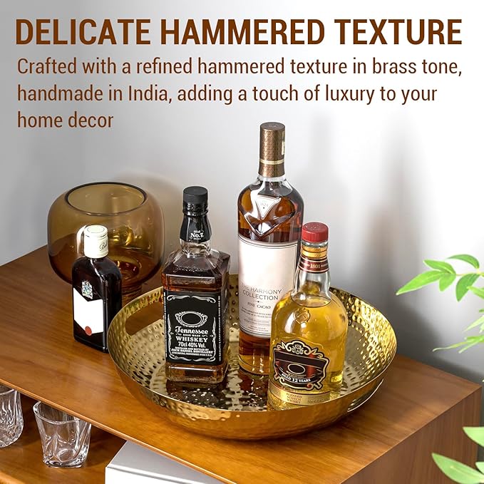 - 14-inch-round deluxe brass-toned hammered aluminum decorative dish with cutout handles serves food or displays items in timeless elegance **Proudly Handcrafted in India**