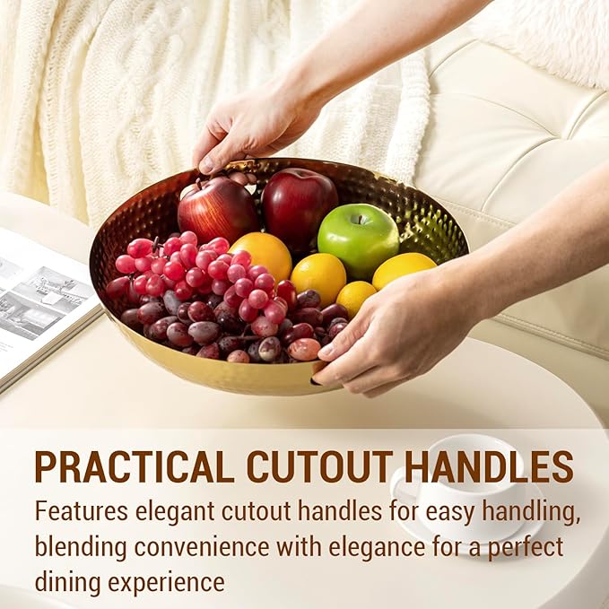 MyGift 14 Inch Deluxe Decorative Dish Tray Centerpiece Base, Brass Tone Plated Hammered Aluminum Fruit Bowl Serving Platter with Cutout Handles - Handcrafted in India