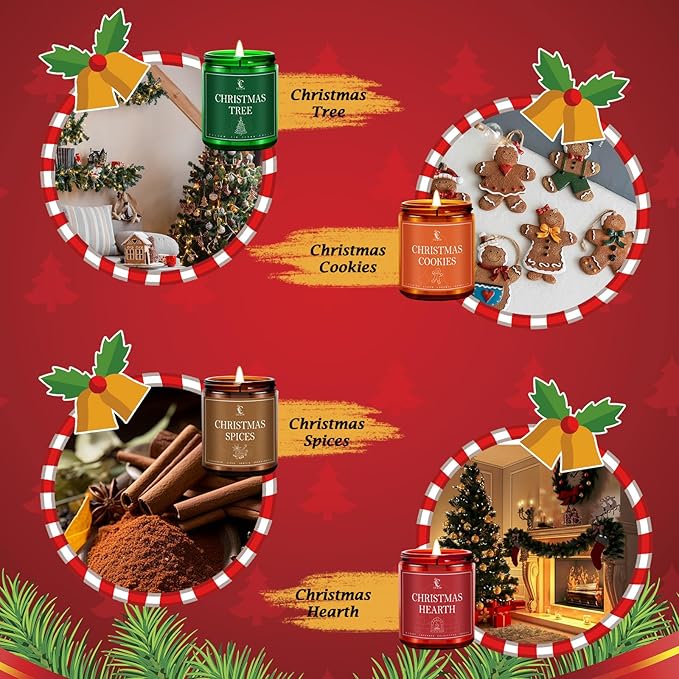 - Diverse Christmas Scents: Immerse in the festive spirit with our scented candles. The Christmas Spice candle blends refreshing mint, warm cloves, sweet vanilla, and exotic sandalwood. The Christmas Tree candle captures the essence of balsam, fir, cedar, and holly, while the Christmas Fireplace candle offers a cozy mix of woody notes, lavender, eucalyptus, and cedar. The Christmas Cookie candle brings the delicious aroma of freshly baked cookies, creamy butter, caramel, and vanilla, providing a wide range of classic Christmas scents.