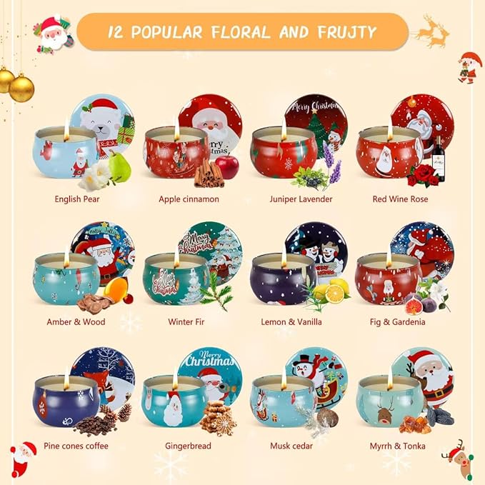 - đă12 CLASSIC FRAGRANCESăOur aromatherapy candle set come with 12 Fragrance Scents: Gingerbread Red Wine,Pine Rose,Cinnamon Apples,Lemon Vanilla,Musk Cedar,Bergamot,Myrrh Tonka,Chime,Lavender,berries Raspberries,Pine&coffee,Fir.