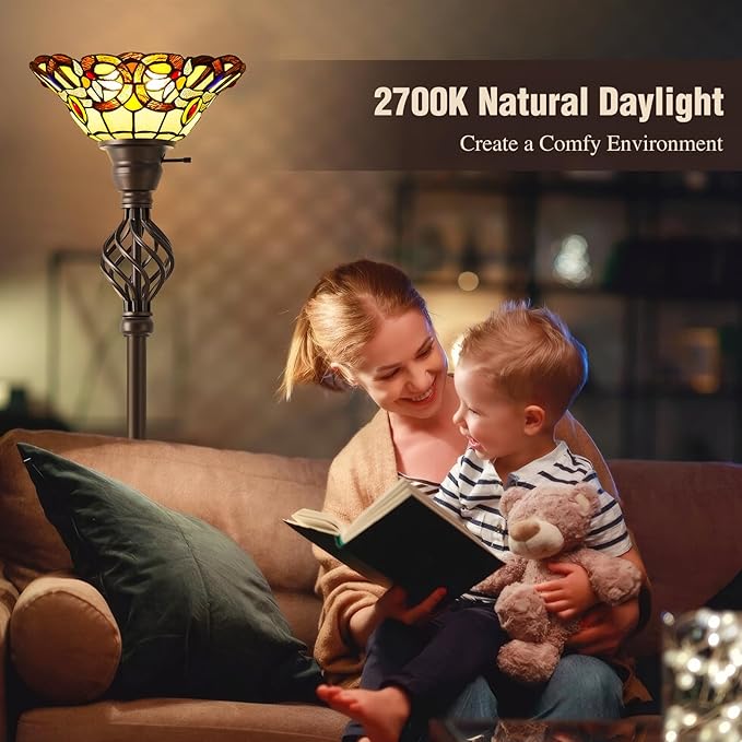 - Vibrant Glass Shades: Equipped with a 9W A19 LED bulb (50,000-hour lifespan), we recommend warm white bulbs for the best effect. Once lit, the vibrant colors come to life, creating a mesmerizing glow that perfectly complements any floor lamps for living room or torchiere floor lamps