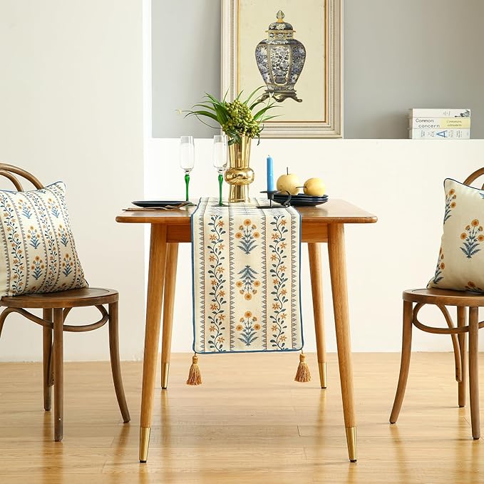 - Unique Design:Each table runner features patterns hand-drawn by our designers,showcasing exquisite details and rich textures for stunning visual appeal.The meticulous stitching ensures a smooth,wrinkle-resistant,and durable finish.With its fresh,rustic yet elegant style,it adds vibrancy and charm to your home decor