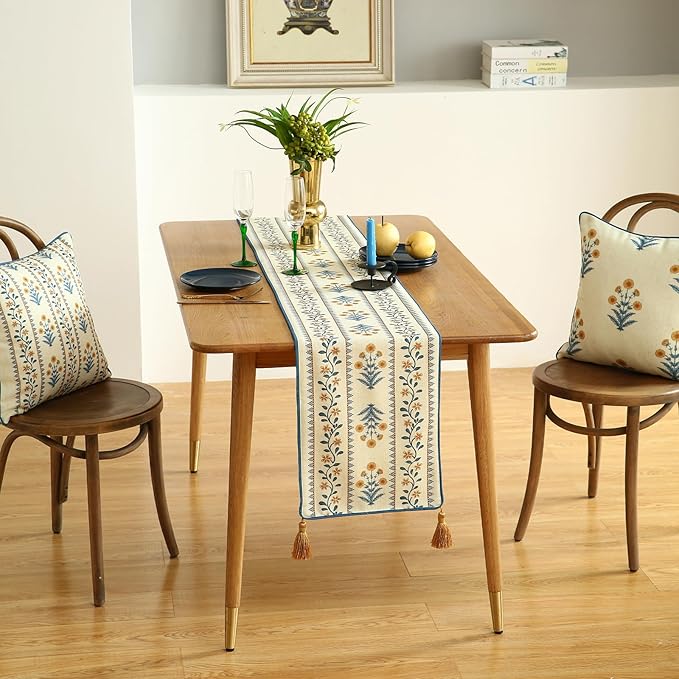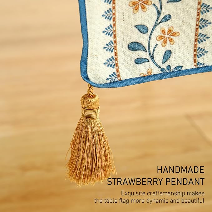 - Unique Design:Each table runner features patterns hand-drawn by our designers,showcasing exquisite details and rich textures for stunning visual appeal.The meticulous stitching ensures a smooth,wrinkle-resistant,and durable finish.With its fresh,rustic yet elegant style,it adds vibrancy and charm to your home decor