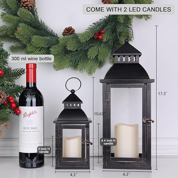 - Suitable for Most Outdoor Scenes——The set of 2 Large Bronze vintage LED candle lantern is perfect for outdoor use. The metal material with LED candles can withstand wind and rain which allows you to see the bright, flickering candles, creating a fantastic atmosphere. (NO GLASS)