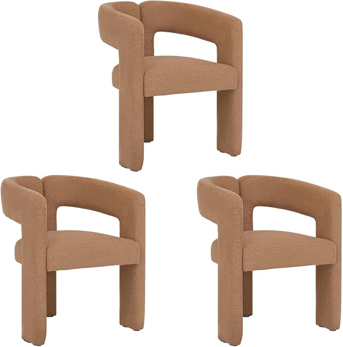 Modern Barrel Dining Chairs Set of 3, Upholstered Linen Dining Room Chair with Wooden Legs, Accent Chairs for Kitchen/Dining Room/Living Room, Brown
