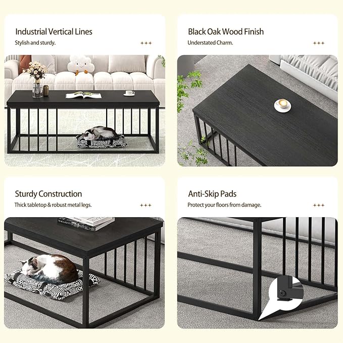 - Unique Design: With open bottom design, this rectangle coffee table provides legroom and creates a cozy space for pets to rest or play. The vertical metal slats are pet-friendly, and the low open space can be used for creative storage or display options