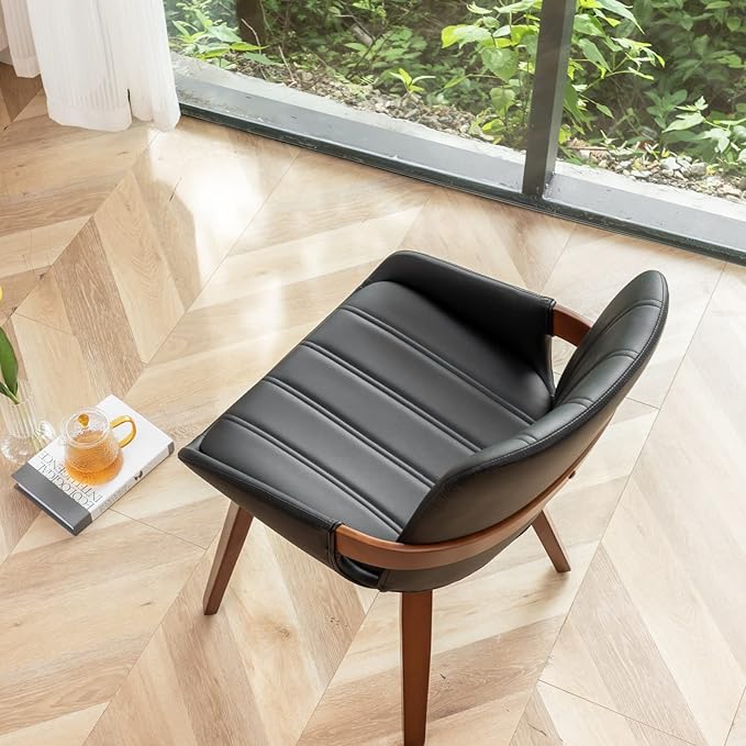 Mid Century Modern Faux Leather Upholstered Dining Chairs,Armless Accent Chairs with Sturdy Natural Wood Legs,Bamboo Backrest Support for Kitchen&Dining Room Chairs(Set of 2,Black PU)
