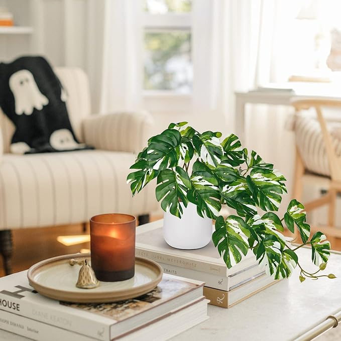 DILATATA Fake Plants Indoor 8 Inch Artificial Monstera Plant in White Ceramic Pot - Faux Potted Tropical Palm Plant for Home Aesthetic Decor Living Room Shelf Office