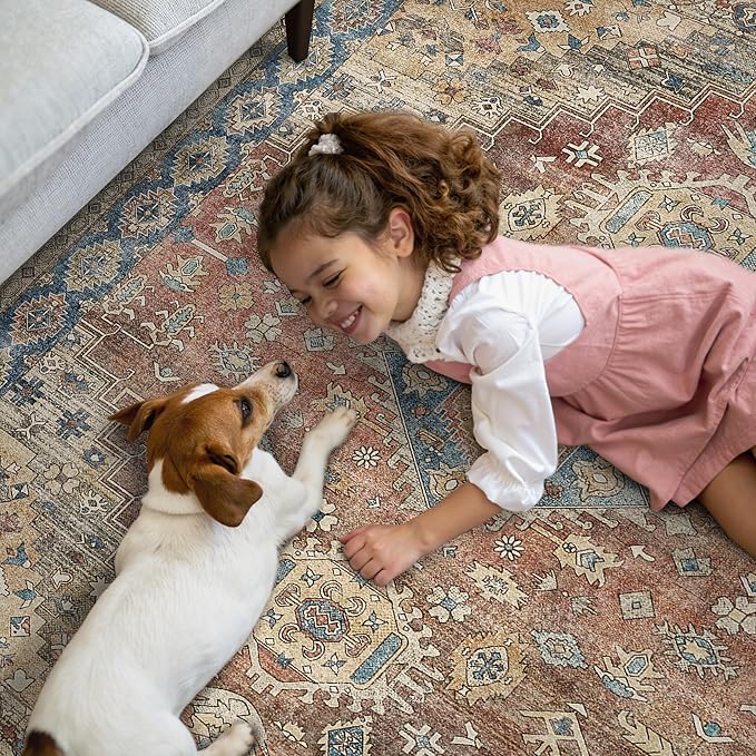 GENIMO 9x12 Area Rugs for Living Room, Machine Washable Non Slip Vintage Rugs, Low Pile Lightweight Chenille Print Rug for Bedroom, Dining Room, Home Office, Antique Red