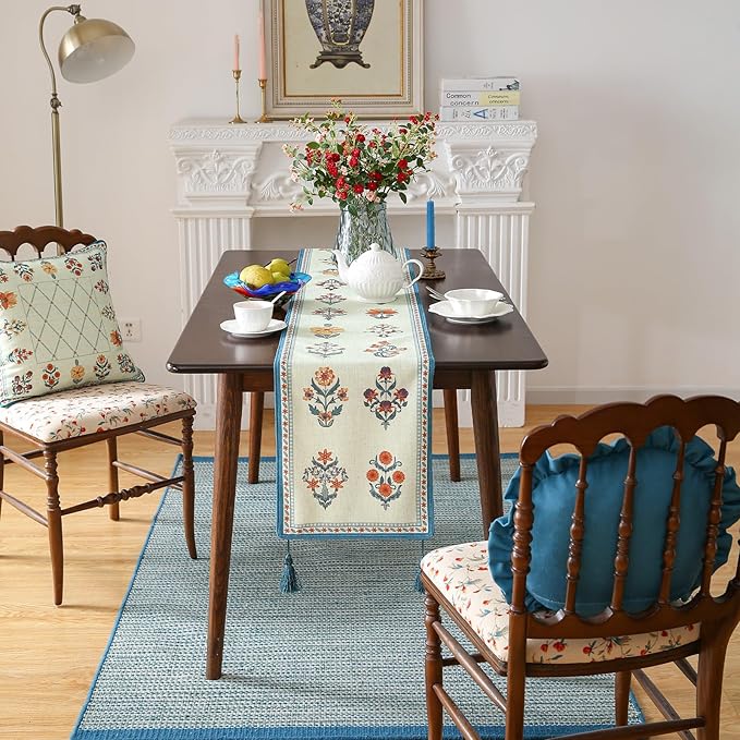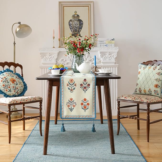 - Unique Design:Each table runner features patterns hand-drawn by our designers,showcasing exquisite details and rich textures for stunning visual appeal.The meticulous stitching ensures a smooth,wrinkle-resistant,and durable finish.With its fresh,rustic yet elegant style,it adds vibrancy and charm to your home decor