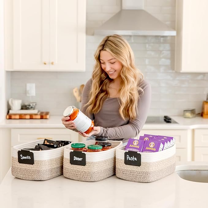 - Safe, Natural Cotton Organizer Bins: Crafted from the highest quality material in the market, our storage bins are oh-so-sturdy (and cute) and ready to take on little humans. They’re 100% safe, so you can rest easy if teething toddlers take a nibble. Reinforced Hidden Handles: Now you see ‘em, now you don’t! With completely hidden handles that blend seamlessly into the rope basket, you’ll be the Houdini of home organizing. They’re even double-stitched and reinforced for extra heavy loads!