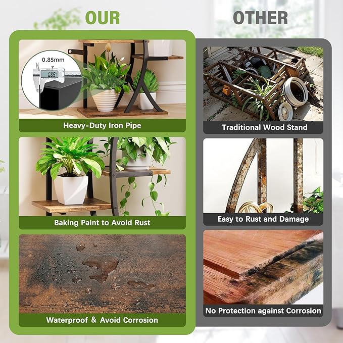 - 【High-Quality Material】This plant holder is built with a robust 0.8mm thick iron pipe frame and high-quality 15mm thick particleboard shelves, offering exceptional durability and stability.The iron pipes are coated with a special rust-resistant finish, and the shelves have a water-resistant layer, making it easy to wipe away spills without causing any damage.