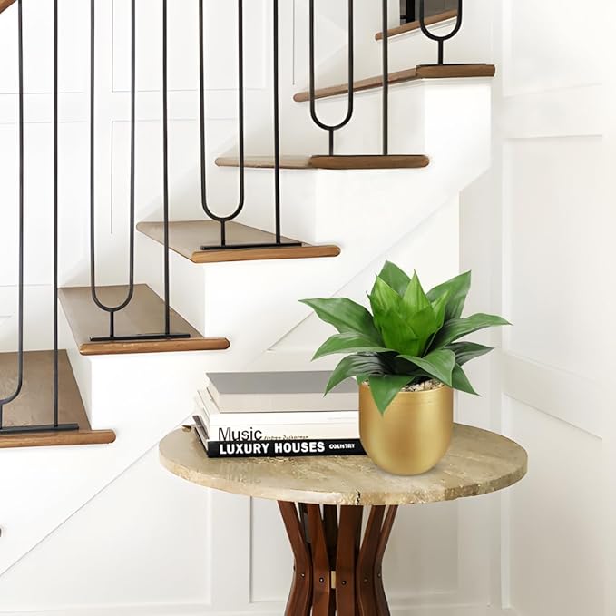 - ELEGANT MATTE GOLD PLANTER WITH PEBBLE FINISH: The smooth golden pot (4.7” diameter x 4.5” high) is filled with realistic river pebbles, offering a clean and modern touch that elevates your decor in an instant.