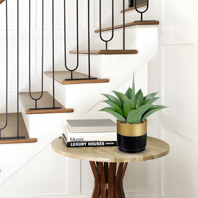Briful Artificial Agave Plant in Black and Gold Metal Pot, 13 Inch Tall Fake Succulent Potted Plants with Wide Gray-Green Leaves, Faux Houseplant for Modern Home Office Shelf Decor