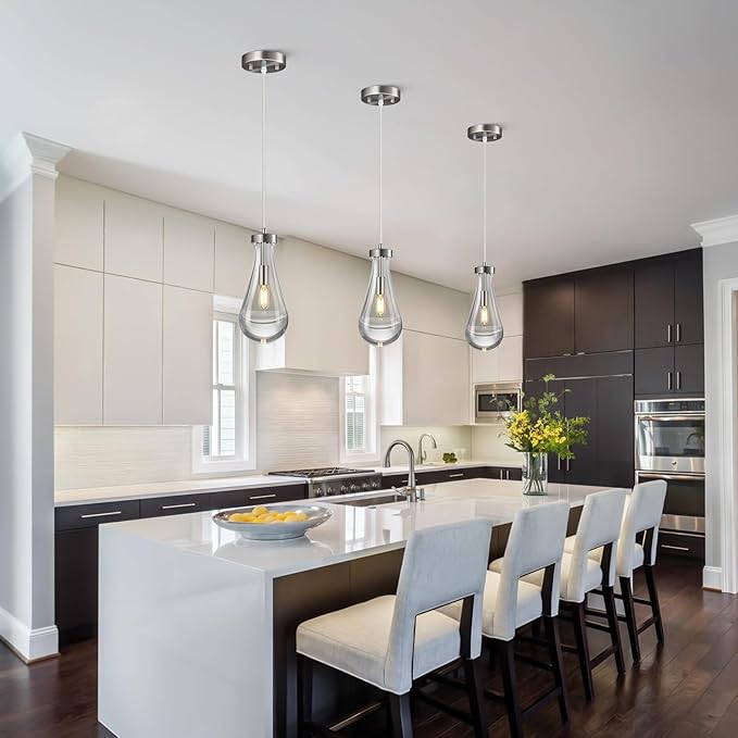 Raindrop Pendant Lights Kitchen Island Teardrop Nickel Hanging Light Fixtures Clear Solid Glass Pendant Light Modern Chandeliers for Dining Room Porch Corridor Living Room(3-Pack)