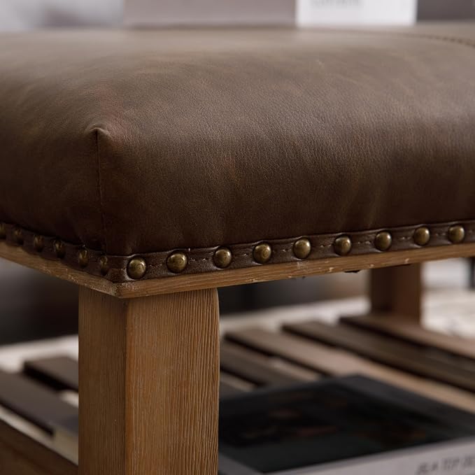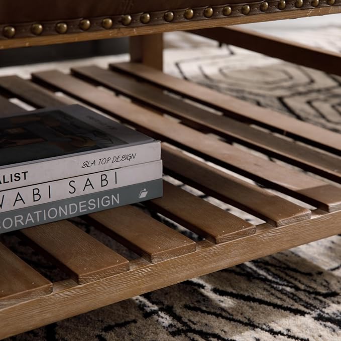 - Mid Century Mordern:Embodying a minimalist design concept,this coffee table features a high-density foam and skin-friendly,durable faux leather top.The antique brass rivets not only serve to reinforce the leather but also add a vintage farmhouse style to the flavor