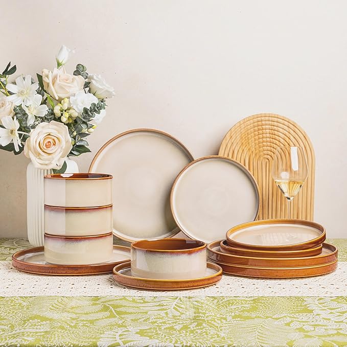 - 【CERAMIC DINNERWARE SETS】 This dinnerware set is designed by professional designers, with unique products and distinctive colors. Each plate highlights its reactive glaze. Moreover, the set features a 0.8-inch-high ridge on the edge, which prevents sauces or condiments from spilling over. You don't have to worry about liquids like gravy or salad dressing overflowing from the sides. This design allows you to enjoy meals happily with your family.