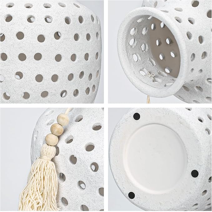 - Rustic Ceramic Hollow Vase & Tassel Detailing - The matte finish and exquisite hollow design show low-key elegance, and the tassel strips perfectly blend the pastoral style with modern minimalist style, creating a light pattern in Bohemian style. And the quality is very high, the high-temperature kiln-fired ceramic material is durable, not easy to fall, hand-polished, and delicate to the touch.