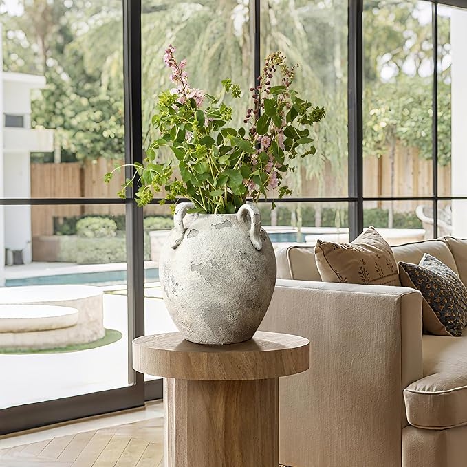 LuxenHome Rustic Ceramic Vase,11'' Gray and White Round Vase,Terracotta Large Flower Vases with Handles for Living Room Home Decor,Vintage Pottery Tall Vases Home Décor Accents