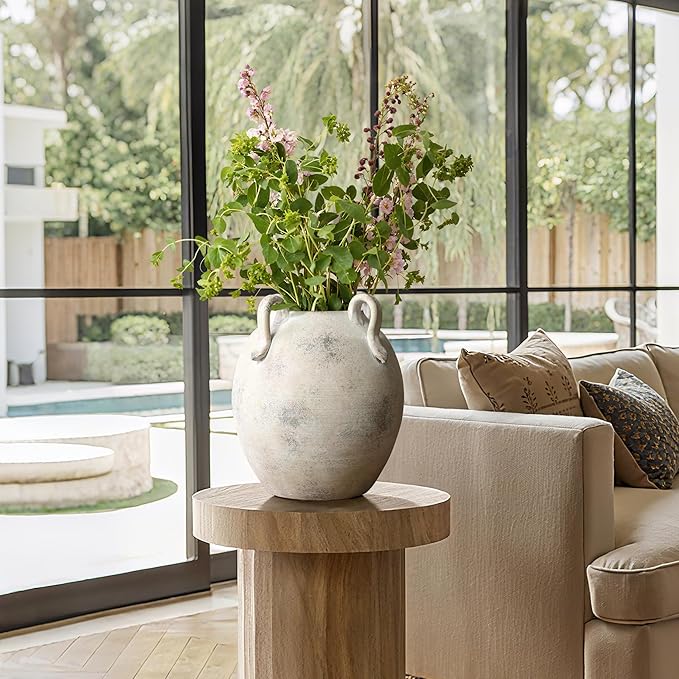 LuxenHome Vintage Ceramic Round Vase Multi Gray and White Terracotta Vaes with Handles Farmhouse Decor,Pottery Vase Living Room Decor,Large Waterpoof Vases Home Decor 11-Inch