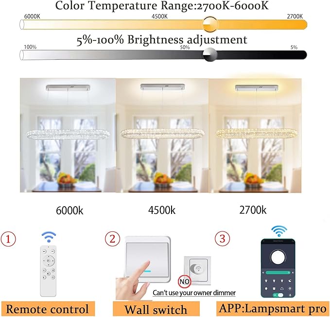 - ✨【Dimmable LED Crystal Ring Chandelier】: 100W.9000Lumens. Including built-in LED light source,and remote control dimmable 3000-6000K color temperature, 5%-100% brightness adjustment,the chandeliers have their own dimmers, which can adjust different light colors according to mood. The AC85-256V voltage can be anywhere.